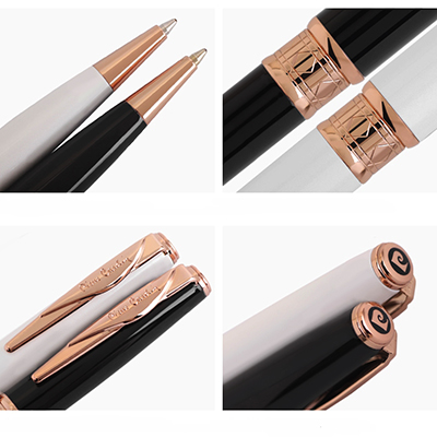 : 트위스트 방식 ■ 캡/바디 : 황동에 블랙 고광택 락카도장 처리 ■ 장식부 : 로즈 골드 전기도금 ■ 탑부 P로고 장식 ■ 클립에 Pierre Cardin 로고를 인그레이빙 ■ 중결링은 형이상학적인 조각문양으로 독특한 분위기를 느낍니다. ■ 리필 : 부드러운 필기감의 1.0mm TC ball (Germany) ■ 파카스타일의 리필과 상호호환이 가능합니다. ■ 레이저(골드색상),실크,패드 인쇄가능 |