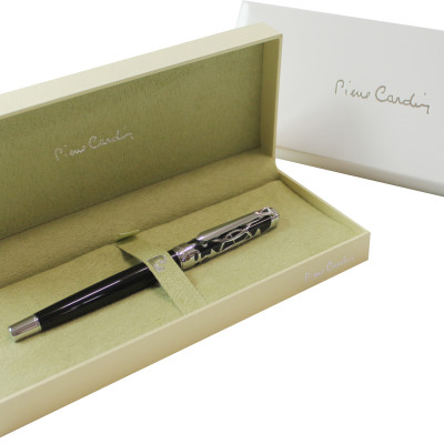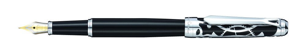 사용방식:캡분리타입. ■ 바디: 메탈에 고광택 블랙락카도장 후 크롬 전기도금 ■ 탑부 사각P로고 장식 ■ 시계태엽문양을 입체적으로 펜캡부위에 입힘. 넥타이모양 클립 ■ 펜촉: 주얼리문양 18K도금 투톤 F Nib |