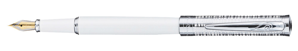사용방식:캡분리타입. ■ 바디: 메탈에 고광택 화이트락카도장 ■ 탑부 원형P로고 장식 ■ 캡부: 에칭공법을이용하여 직물무늬를냄 ■ 펜촉: 주얼리문양 18KGP 투톤 F Nib ■ 레이저(골드색상),실크,패드 인쇄가능 |