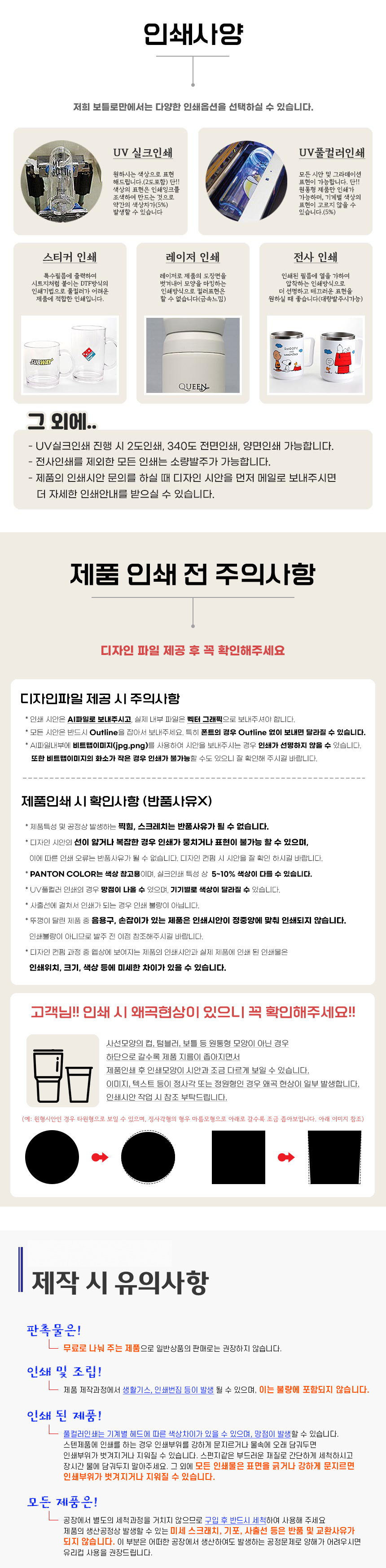 | 기타사항 | - 본 제품은 기본속캡 제공되지 않으며, 쉐이커 속캡을 옵션으로 선택하실 수 있습니다. - 1도인쇄 100개 미만 인쇄비 별도로 추가됩니다. - 풀컬러 인쇄비용은 별도로 문의하여 주시기 바랍니다. - 개별인박스는 예고없이 변경될 수 있습니다. - 700ml 제품은 비용이 추가됩니다. - 기타 옵션사항은 별도로 문의하여 주시기 바랍니다. |