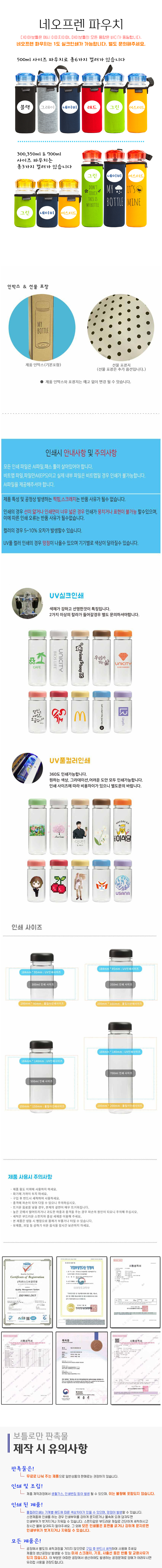 | 기타사항 | - 1도인쇄 100개 미만 인쇄비 별도로 추가됩니다. - 풀컬러 인쇄비용은 별도로 문의하여 주시기 바랍니다. - 개별인박스는 예고없이 변경될 수 있습니다. - 700ml 제품은 비용이 추가됩니다. - 기타 옵션사항은 별도로 문의하여 주시기 바랍니다. |